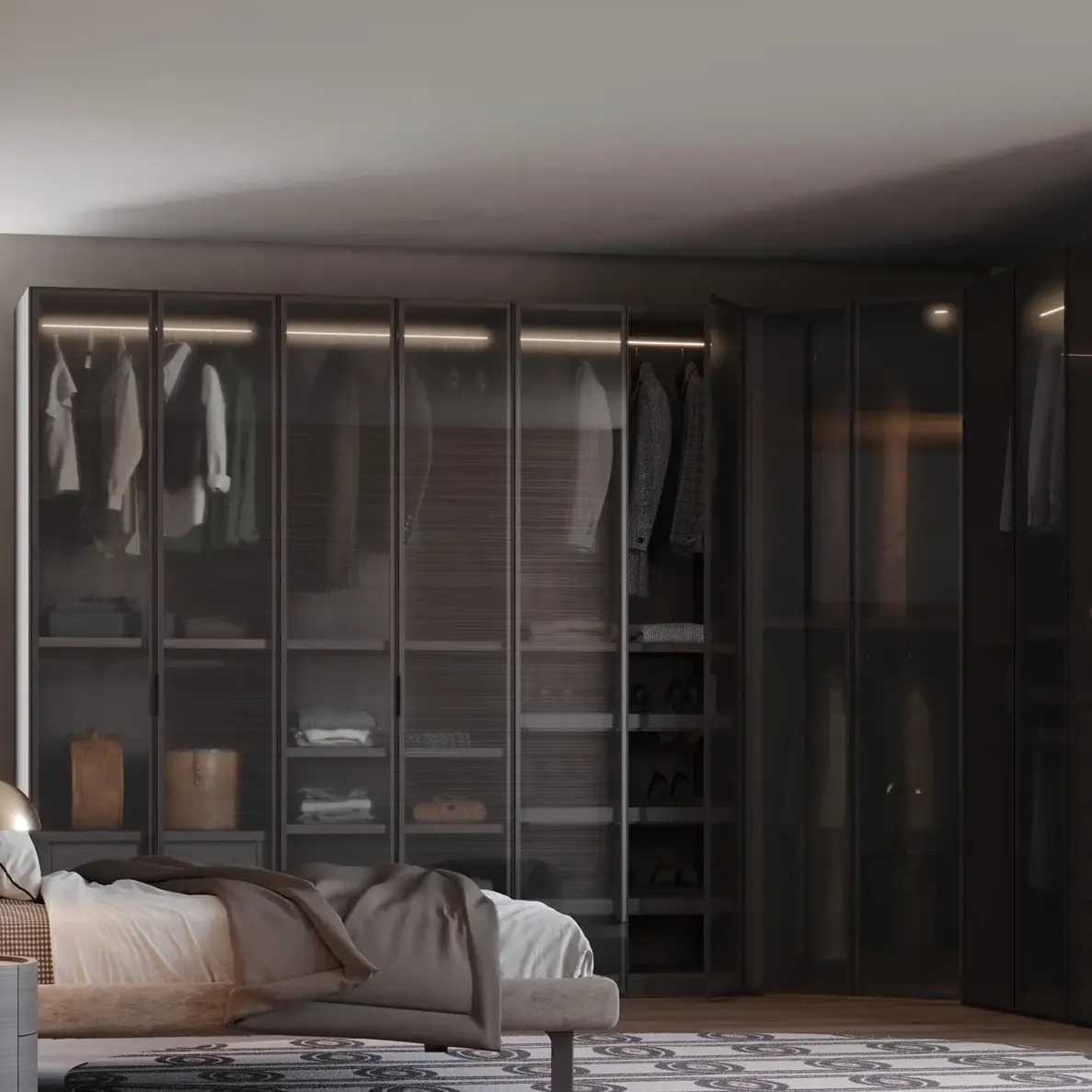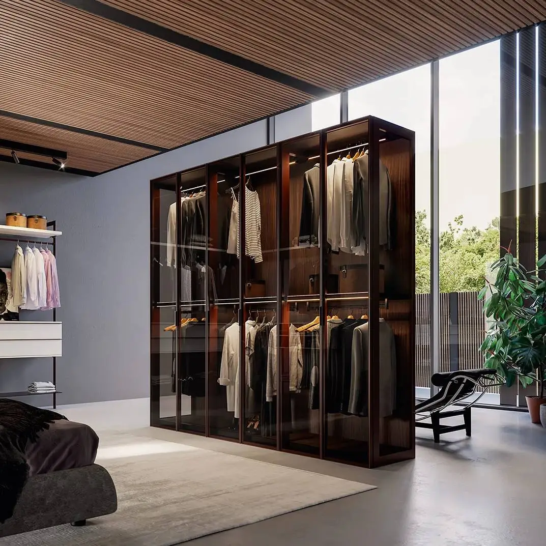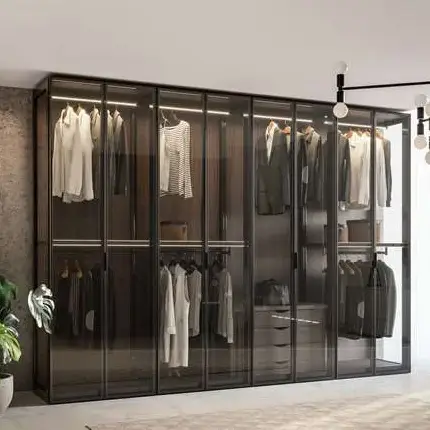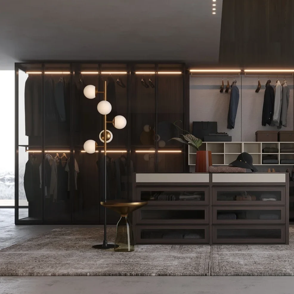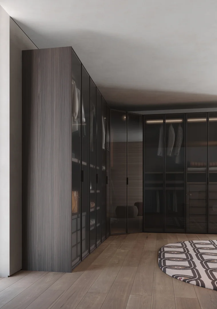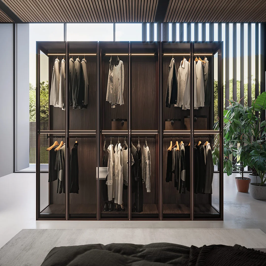 Yes, that does indeed exist: with the glass door cupboard “Open”. We offer a solution which, on the one hand, takes up many advantages of the walk-in wardrobe. Thanks to glass doors and side panels the daylight can pass through the entire storage space and create an open, non-constricting room image, while integrating the benefits of doors in this cupboard system.