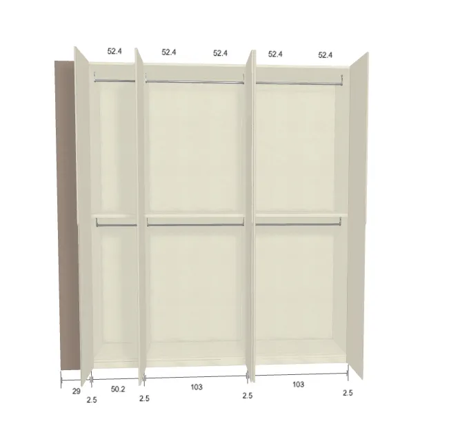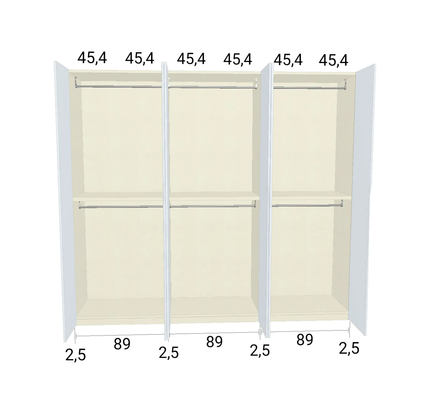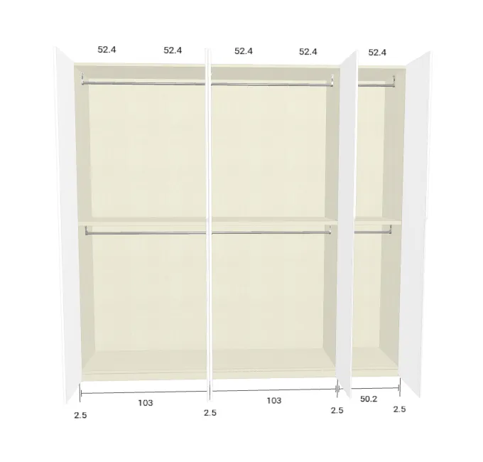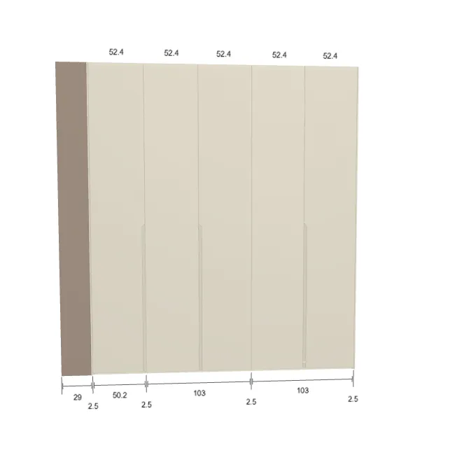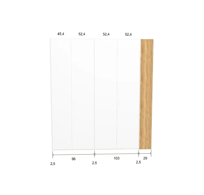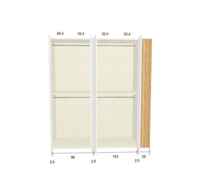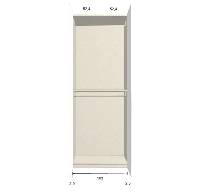 Modèle de porte: Intégrée Finition des portes et des joues extérieures: RAL 9003 - Mat Finition intérieure: Lino Barre de penderie: Chromé Hauteur armoire: 294 cm Gardez 1 cm de moins de la hauteur de la pièce. Profondeur armoire: 61 cm Largeur armoire: 231.2 cm Attention: Si l'installation a lieu dans une niche ou d'un mur à l'autre, au moins 3 cm sont nécessaires pour le montage! Si cette situation vous convient, veuillez nous contacter - nous avons la solution prête! Module avec une porte: Droite ![]() ![]() | |||||||