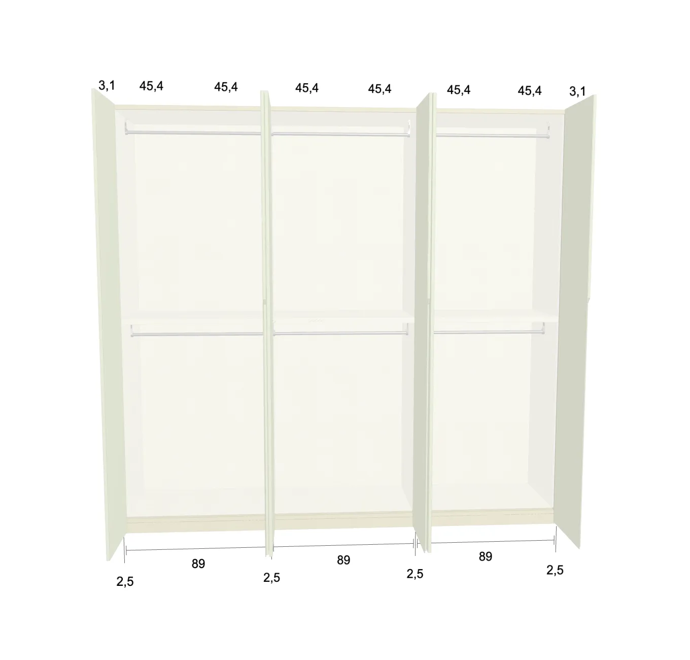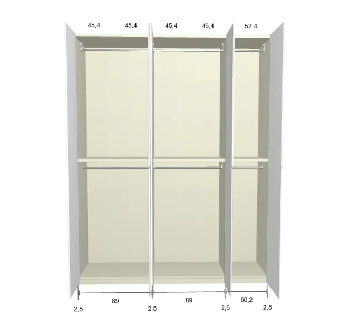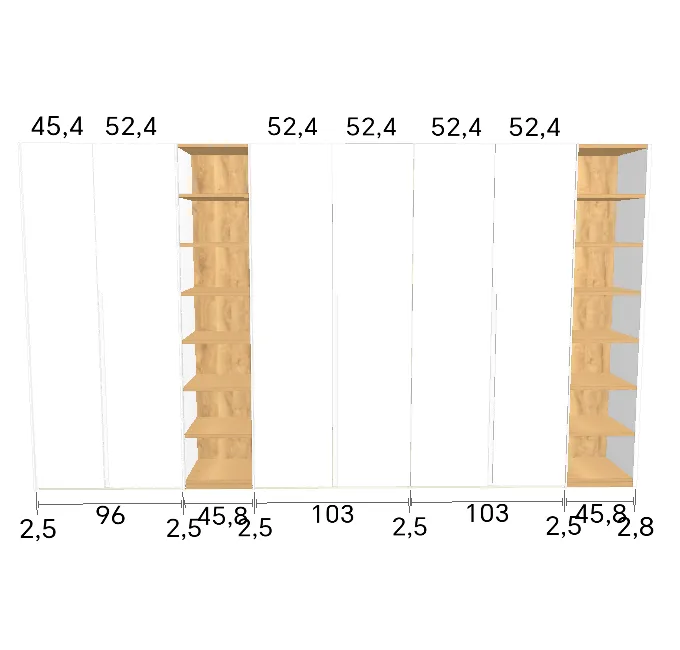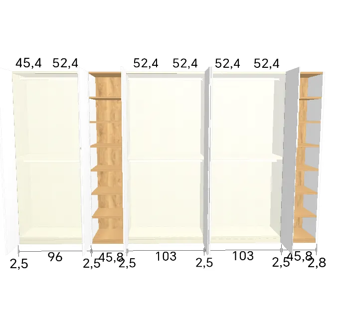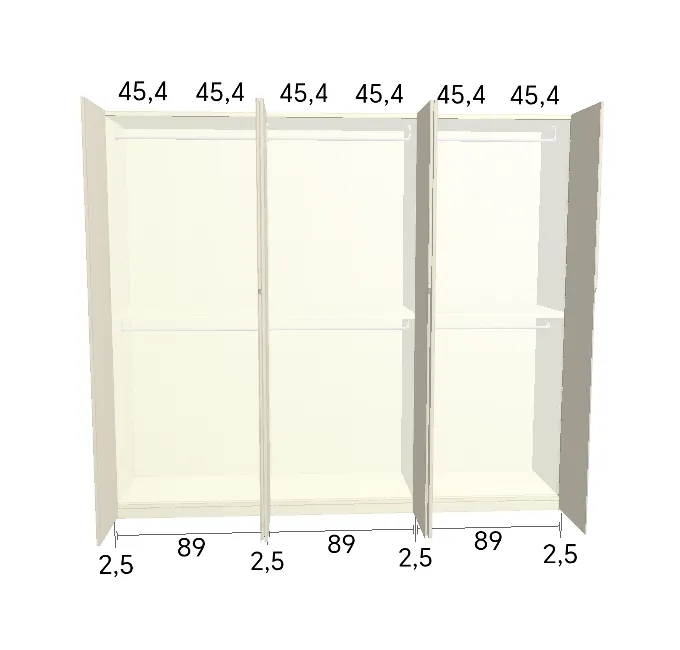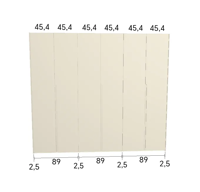 Modèle de porte: Intégrée Finition des portes et des joues extérieures: FB 201 shaded white - Mat Finition intérieure: Sabbia Barre de penderie: Chromé Hauteur armoire: 246 cm Gardez 1 cm de moins de la hauteur de la pièce. Profondeur armoire: 61 cm Largeur armoire: 277 cm Attention: Si l'installation a lieu dans une niche ou d'un mur à l'autre, au moins 3 cm sont nécessaires pour le montage! Si cette situation vous convient, veuillez nous contacter - nous avons la solution prête! Modules avec LED verticale (numérotés à partir de la gauche): Premier, deuxième et troisième module ![]() ![]() | |||||||