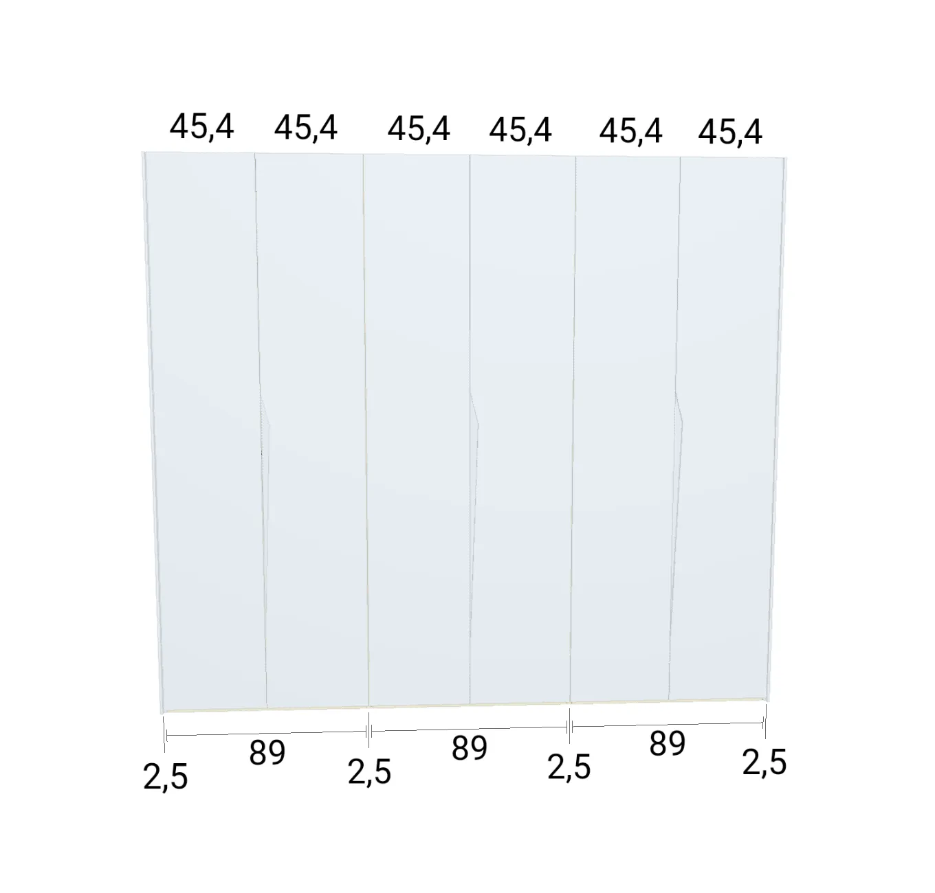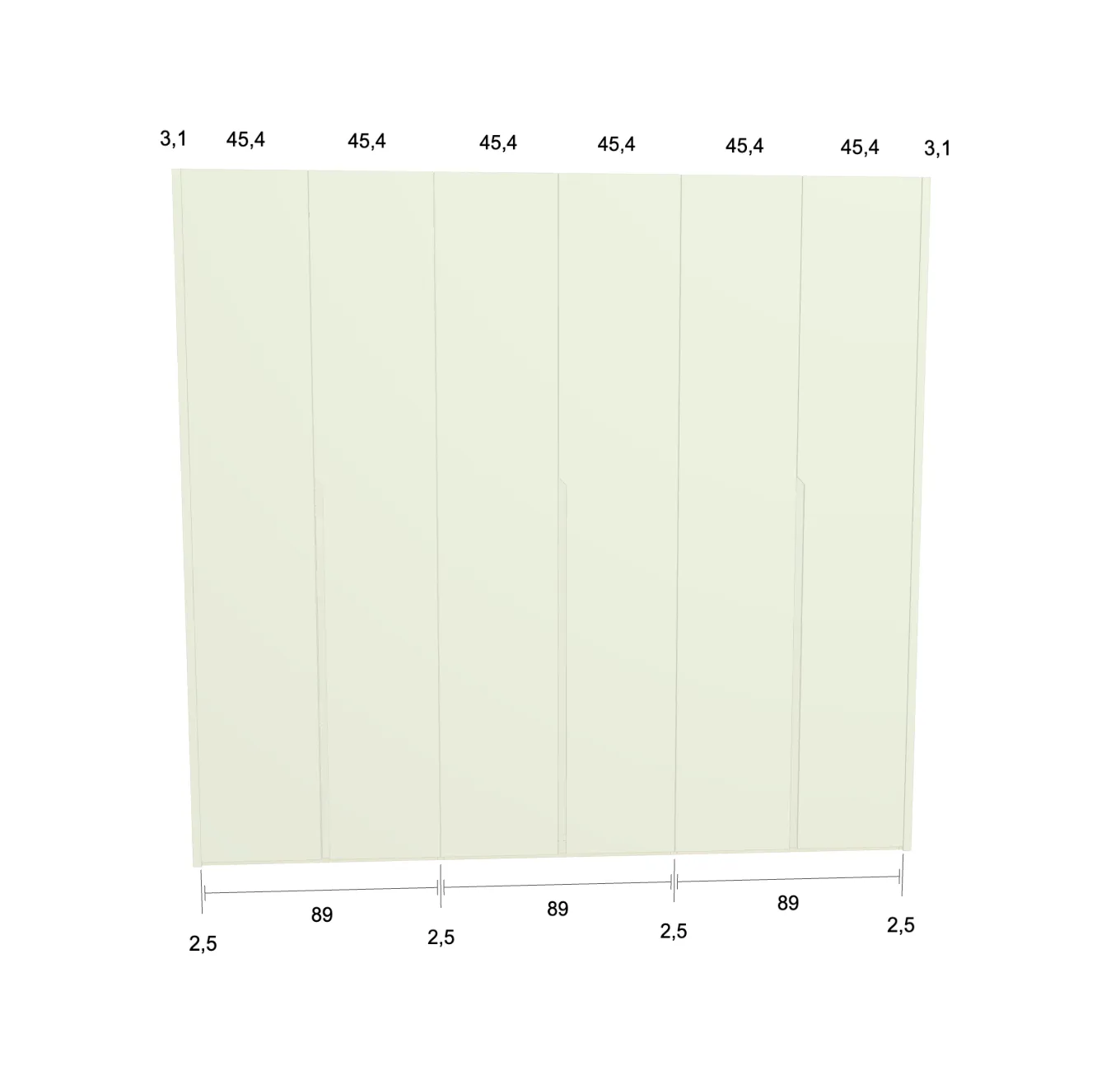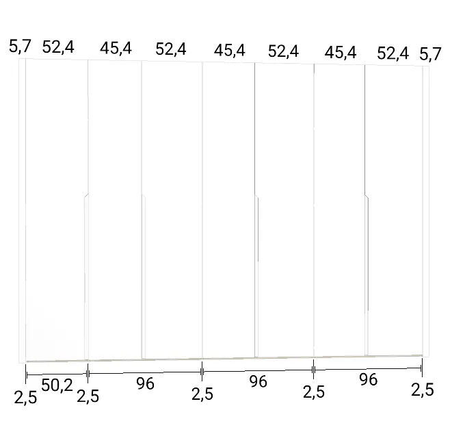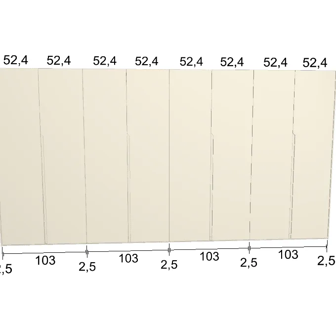 Modèle de porte: Intégrée Finition des portes et des joues extérieures: FB 201 shaded white - Mat Finition intérieure: Sabbia Barre de penderie: Chromé Hauteur armoire: 246 cm Gardez 1 cm de moins de la hauteur de la pièce. Profondeur armoire: 61 cm Largeur armoire: 277 cm Attention: Si l'installation a lieu dans une niche ou d'un mur à l'autre, au moins 3 cm sont nécessaires pour le montage! Si cette situation vous convient, veuillez nous contacter - nous avons la solution prête! Modules avec LED verticale (numérotés à partir de la gauche): Premier, deuxième et troisième module ![]() ![]() | |||||||