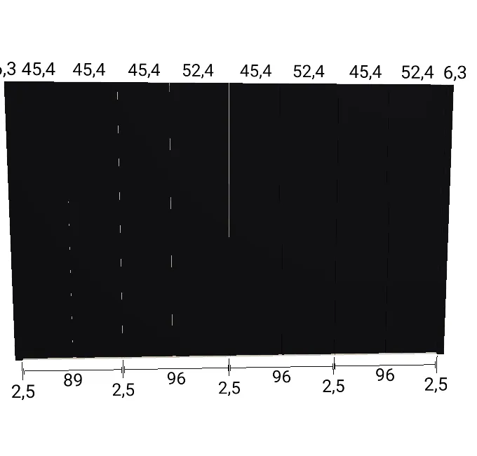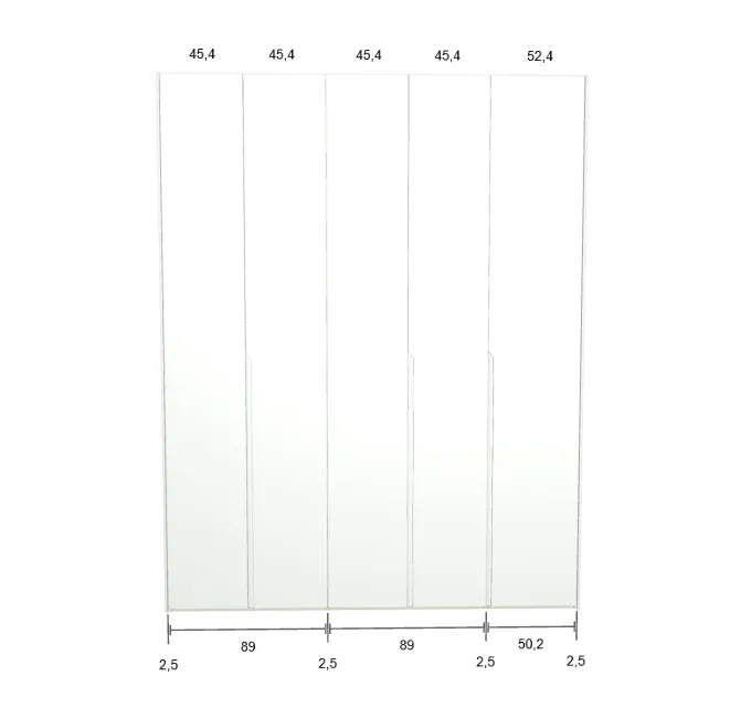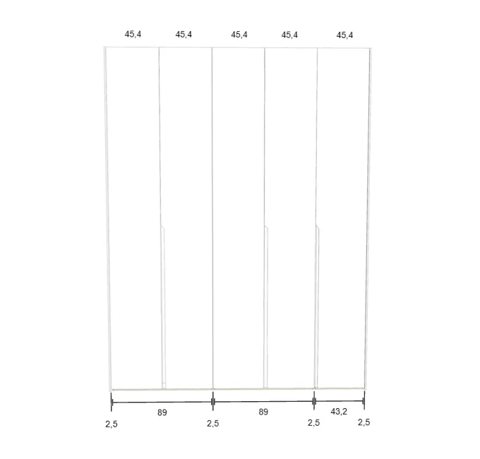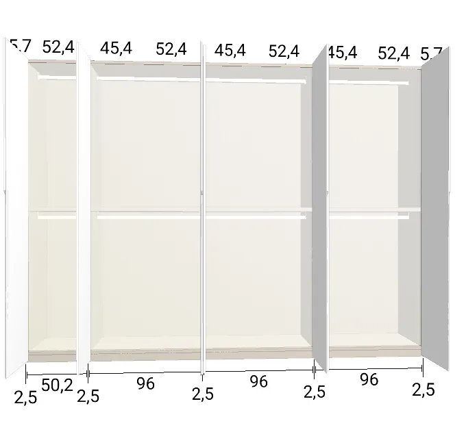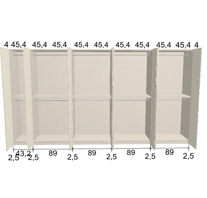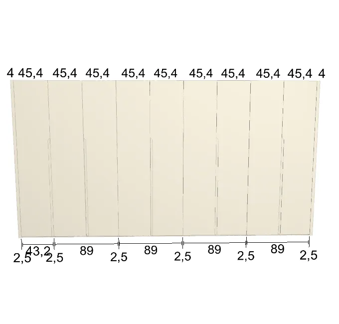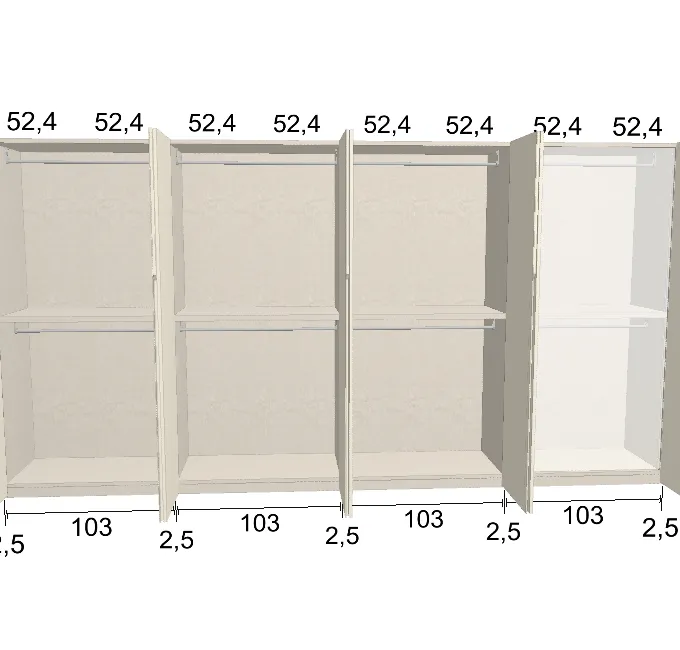 Modèle de porte: Intégrée Finition des portes et des joues extérieures: FB 201 shaded white - Mat Finition intérieure: Lino Barre de penderie: Chromé Hauteur armoire: 225 cm Gardez 1 cm de moins de la hauteur de la pièce. Profondeur armoire: 61 cm Largeur armoire: 424.5 cm Attention: Si l'installation a lieu dans une niche ou d'un mur à l'autre, au moins 3 cm sont nécessaires pour le montage! Si cette situation vous convient, veuillez nous contacter - nous avons la solution prête! Modules avec LED verticale (numérotés à partir de la gauche): Quatrième module ![]() ![]() | |||||||