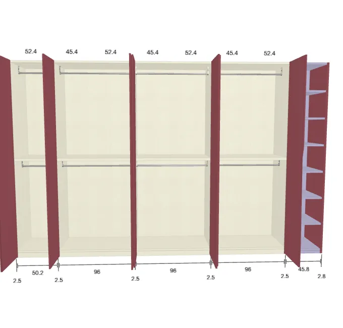 Modèle de porte: Intégrée Finition des portes et des fileurs: FB 201 shaded white - Mat Finition intérieure: Lino Barre de penderie: Chromé Hauteur de la niche: 225 cm Hauteur armoire: 224 cm Profondeur armoire: 61 cm Largeur de la niche: 420 cm Module avec une porte: Gauche Fileur: Un grand panneau à couper sur place ![]() ![]() | |||||||