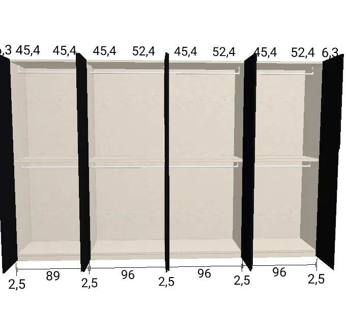 Modèle de porte: Intégrée Finition des portes et des fileurs: RAL 9005 - Mat Finition intérieure: Lino Barre de penderie: Chromé Hauteur de la niche: 250 cm Hauteur armoire: 249 cm Profondeur armoire: 61 cm Largeur de la niche: 400 cm Fileur: Un grand panneau à couper sur place ![]() ![]() | |||||||