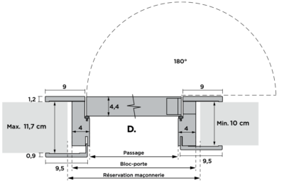 L’ huisserie est fabriqué en bois contreplaqué épaisseur 40 mm, laqué. Attention : en présence d’un mur d’une épaisseur supérieure à 11,7 cm, l’huisserie est constitué de deux pièces.